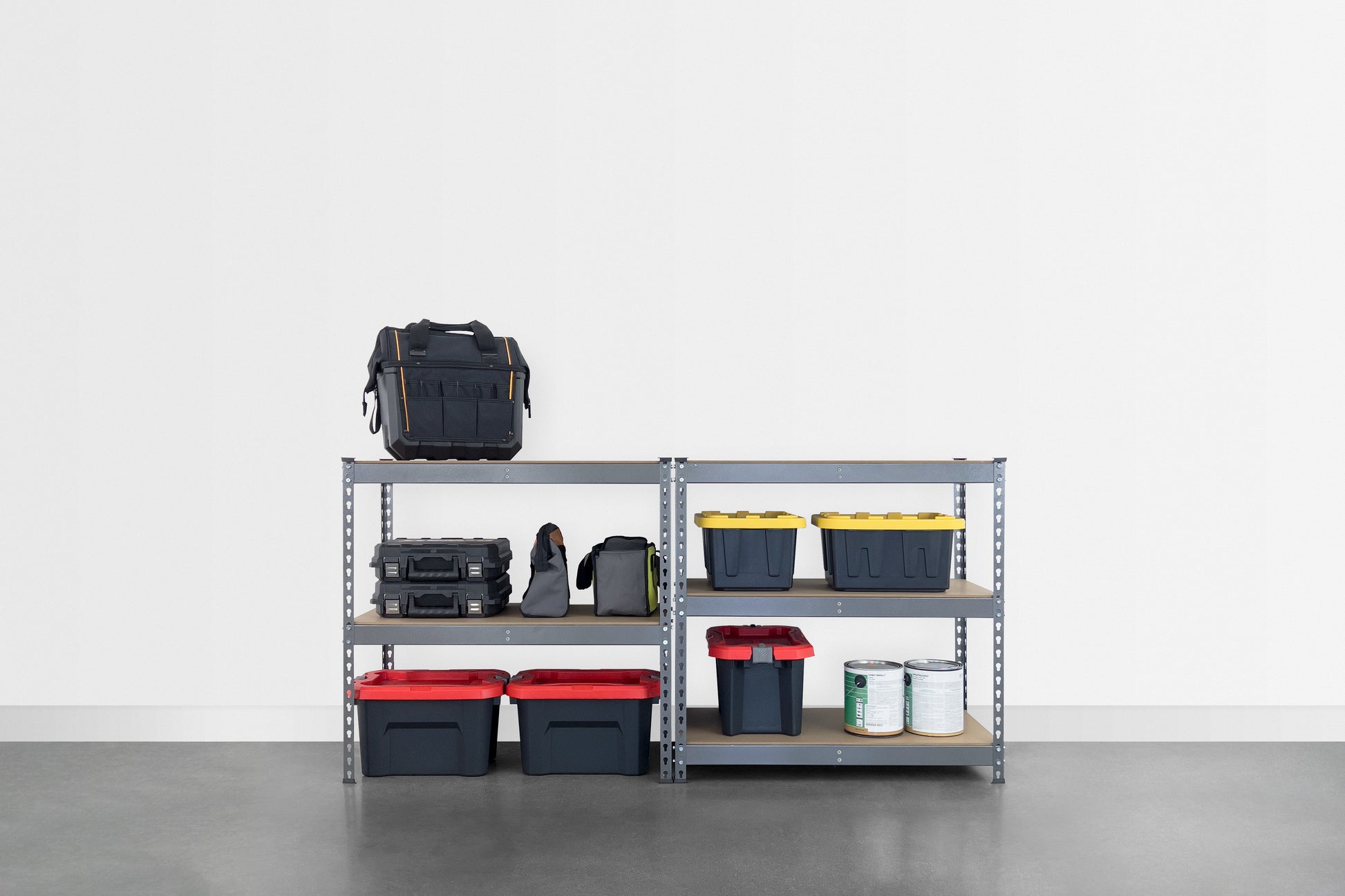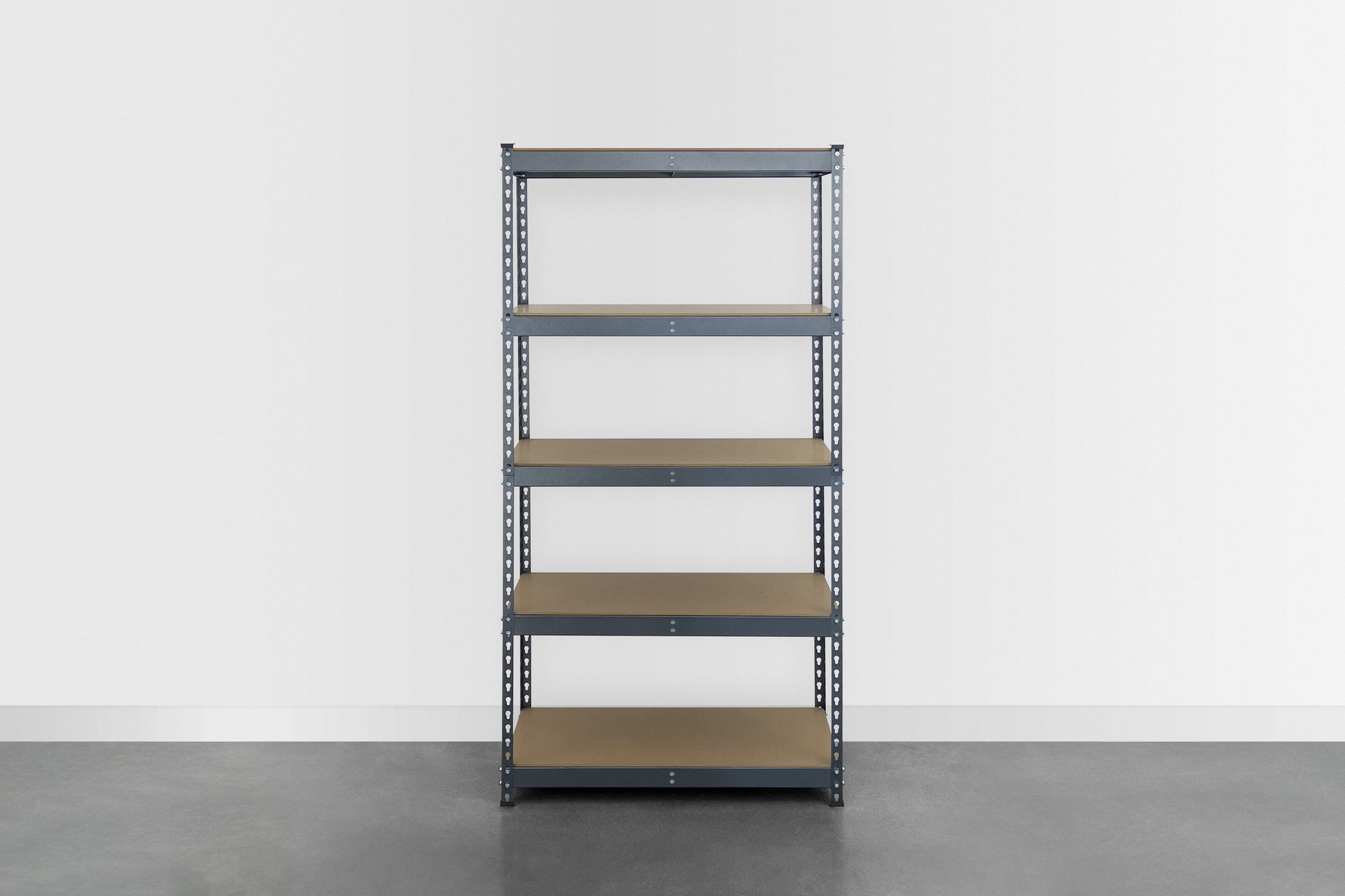 Achieve your storage goals with our shelving unit, designed with customizable heights for perfect organization of tools, equipment, and household items.