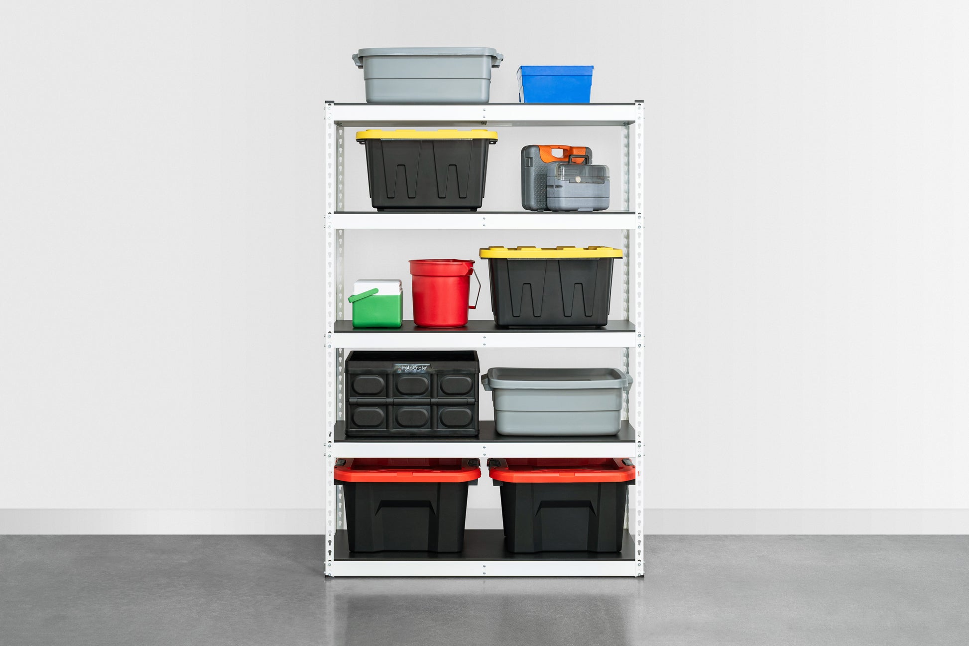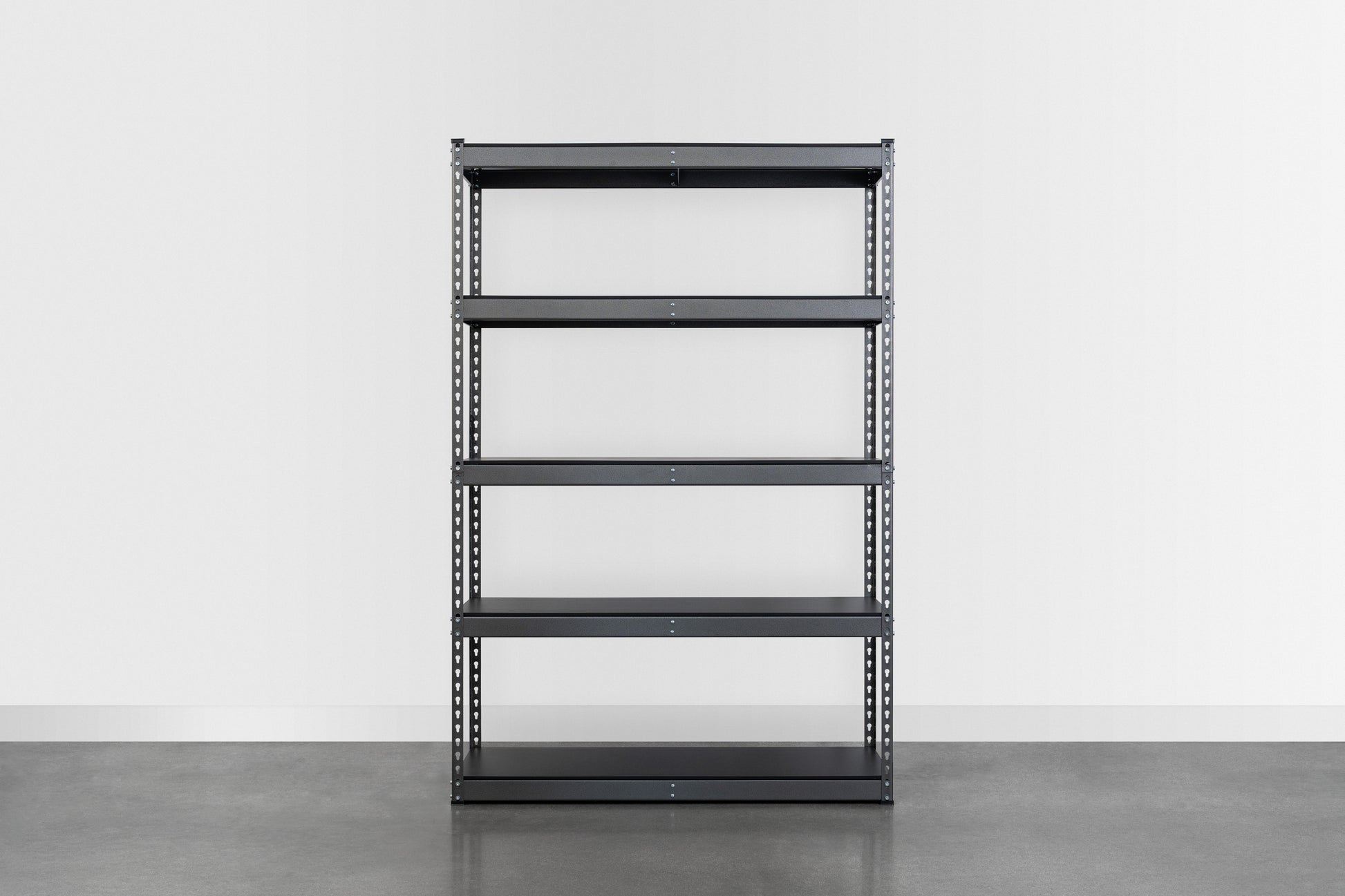 Achieve your storage goals with our shelving unit, designed with customizable heights for perfect organization of tools, equipment, and household items.