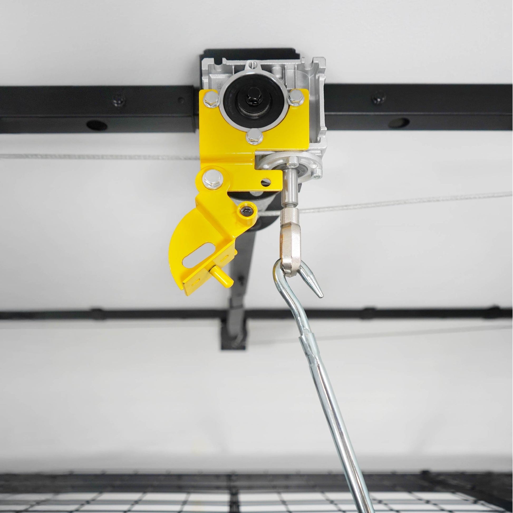 - Drill-powered crank hoist lowers rack up to 9 feet