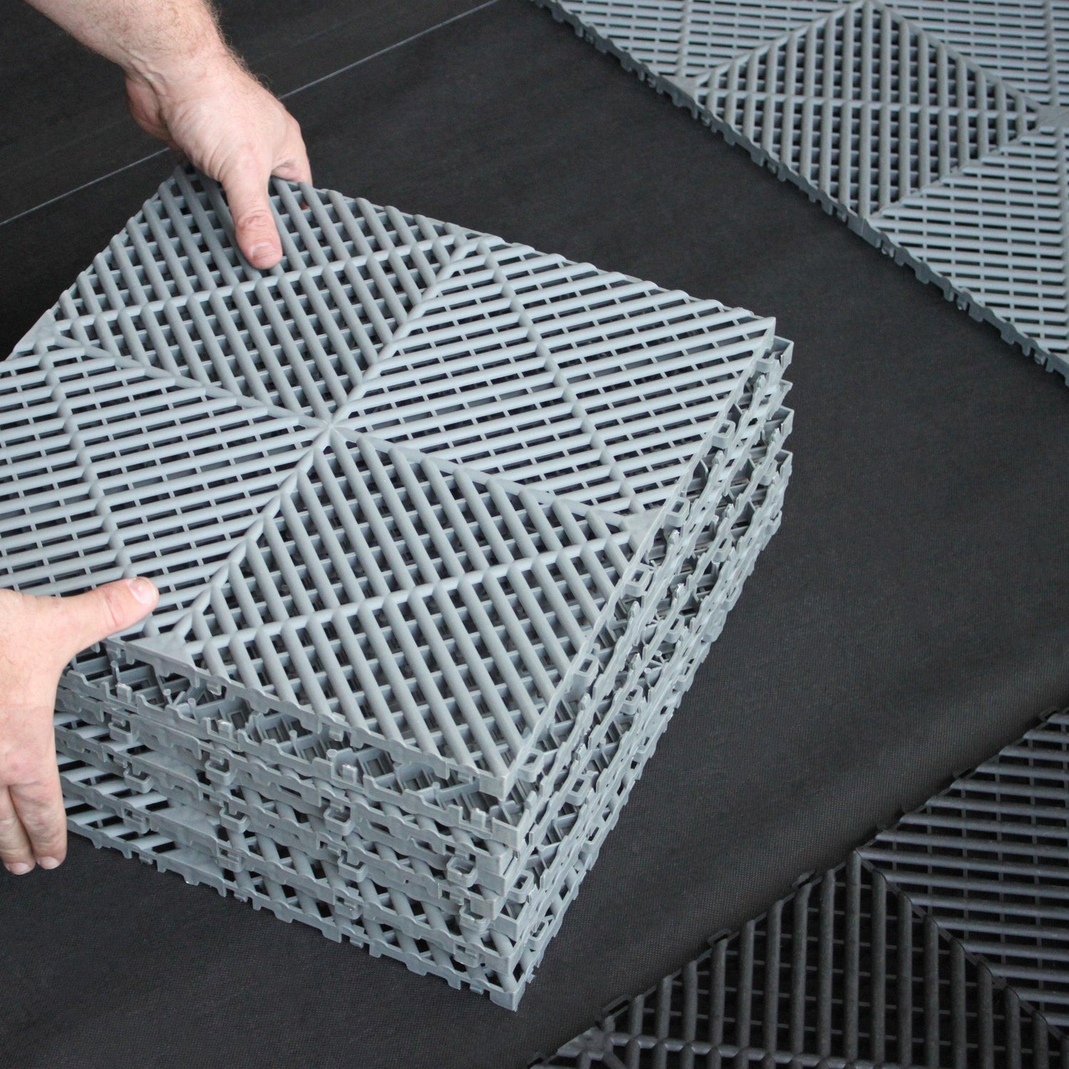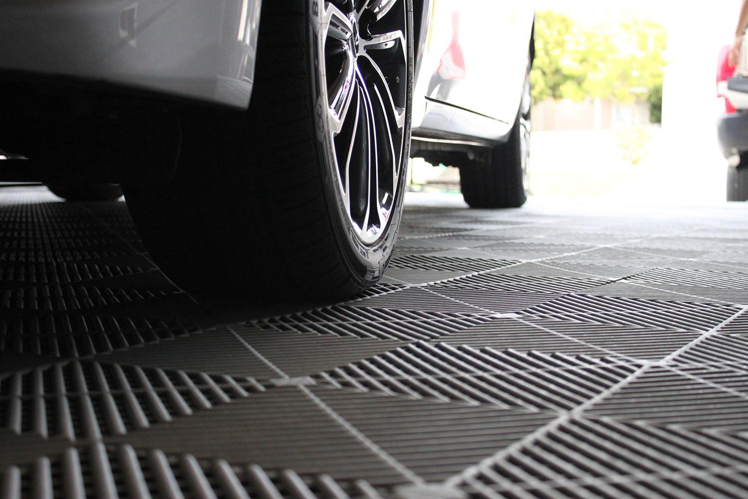SafeRacks garage flooring allows you to create your dream garage or showroom. The perfect epoxy alternative, our tiles are 100% customizable and easy to install. An easy DIY solution for your garage, basement or workspace, these floor tiles are the ideal solution to transform your garage or workshop. Additionally, open-air channels underneath the tiles facilitate efficient water drainage and airflow, preventing moisture build-up and enhancing the lifespan of your garage flooring.