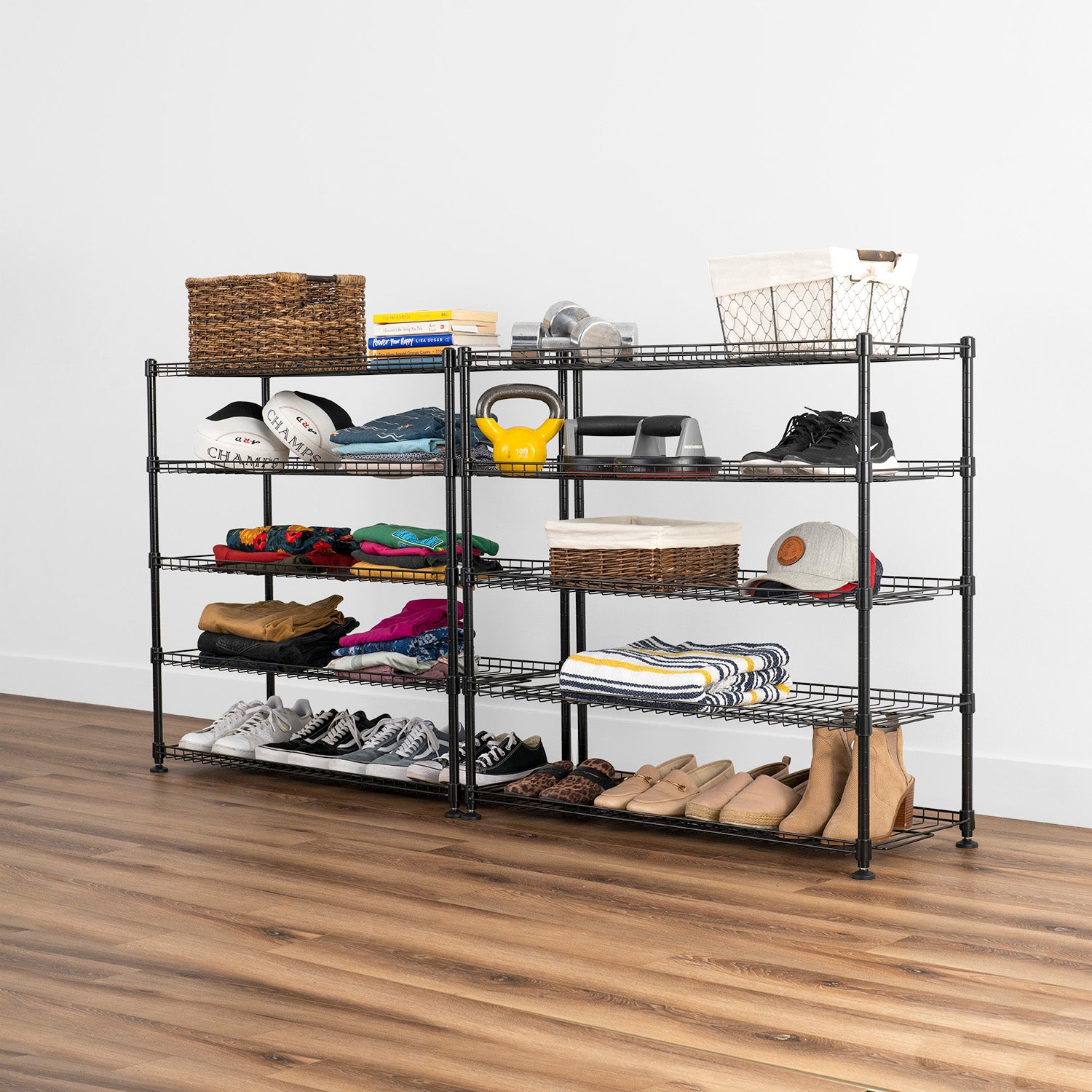 The SafeRacks shoe rack is the heavy-duty giant capable of storing up to 60 pairs of shoes. The 10-tier shoe rack features adjustable wire shelves and can be assembled as one unit or as two units. Finished in black, the shoe rack is the perfect fit for most bedrooms, garages, or closets. Our 14" x 36" x 68" shoe rack features 10 adjustable shelves and up to 60 shoe pair capacity.